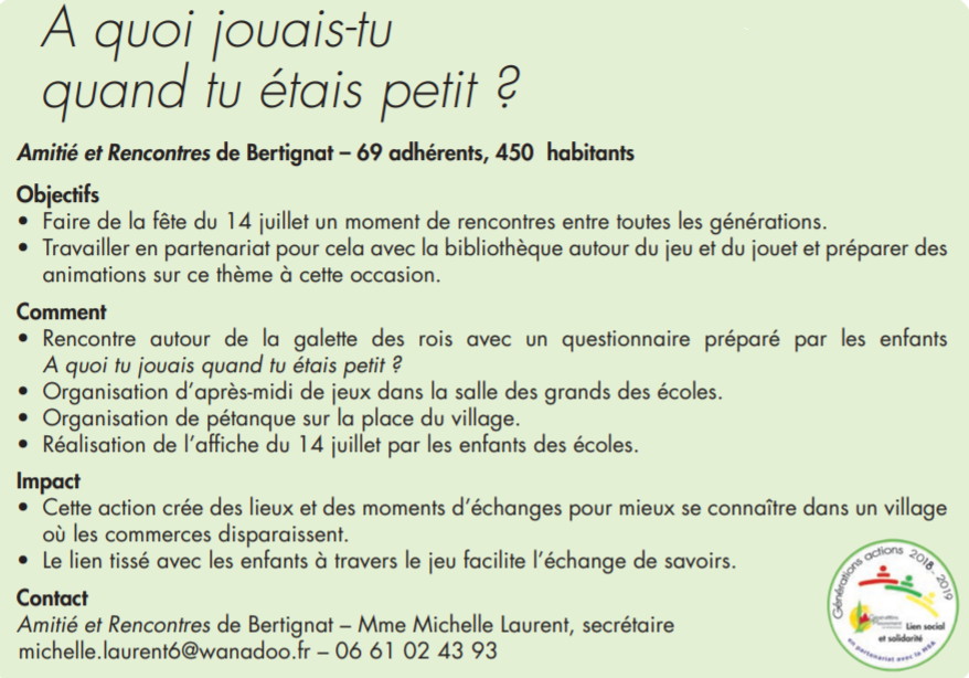 Signalons que l’association Amitié et Rencontre fut primée en 2019 dans le cadre du concours Générations actions organisé en partenariat avec la Mutualité sociale agricole pour son action A quoi jouais-tu quand tu étais petit ?