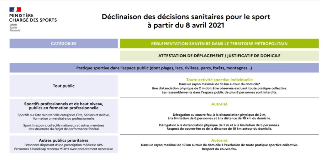 - A 6 personnes maximum, encadrant compris, dans l’espace public (dont les plages, lacs, rivières, parcs, forêts, montagnes, stations de ski…), et sans limite de nombre dans les ERP de plein air (terrain de sport, stades…),
