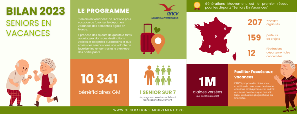 Depuis 15 ans, l’ANCV est un partenaire important de Générations Mouvement dans la promotion des vacances pour tous. En parfaite adéquation avec notre public et nos valeurs, c’est tout naturellement que le programme “Seniors en vacances” a su trouver sa place, avec de plus en plus de porteurs de projets parmi nos associations. Le succès de ces séjours ne cesse de croître auprès des adhérents, avec 1 bénéficiaire sur 7 provenant de Générations Mouvement en 2023, ce qui représente 10 341 bénéficiaires, 207 voyages et un million d’euros d’aide versés.
